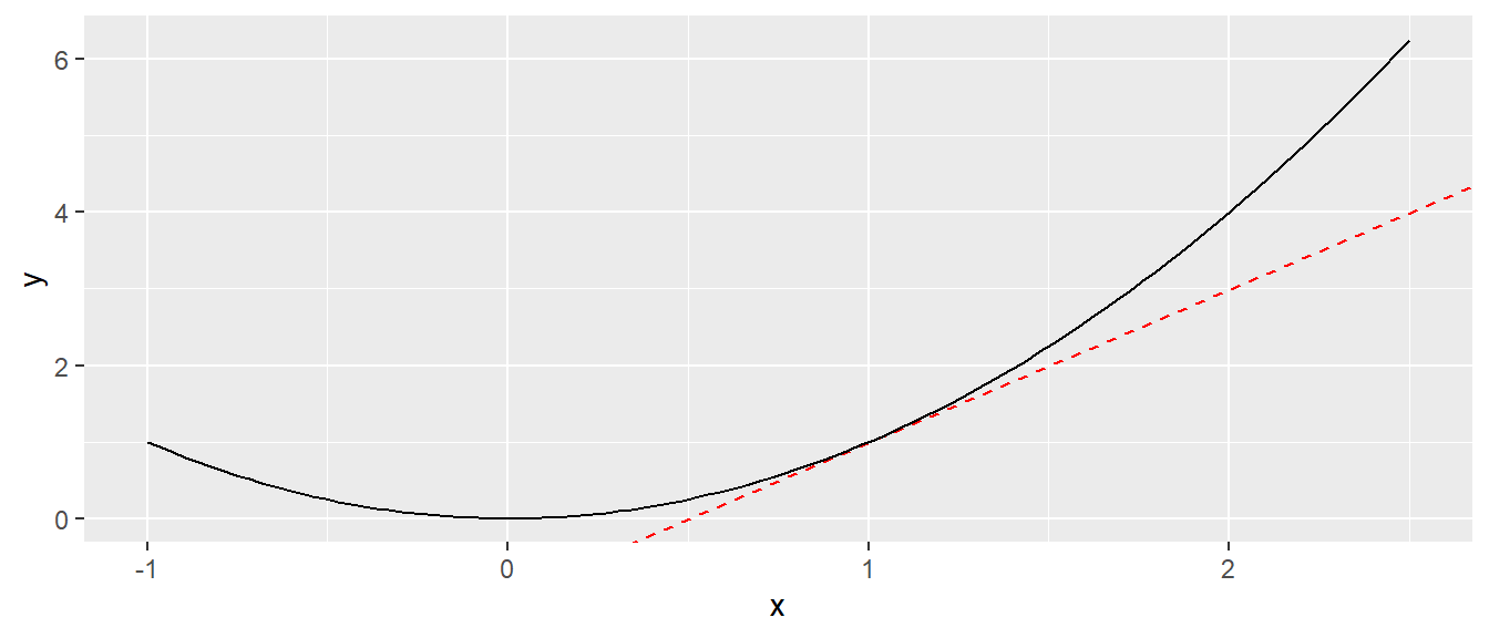 Sei zum Beispiel die Funktion \(y = f(x) = x^2\) gegeben und es soll die Steigung der Parabel im Punkt \(x = 1\) berechnet werden. Aus der Ableitungsregel für die Potenz folgt \(f'(x) = \frac{d x^2}{dx} = 2x\). Somit ergibt sich für die Ableitung im Punkt \(x = 1\) für die Ableitung und die Steigung in \(x\) der Wert \(f'(2) = 2 \cdot 2 = 4\). In Abbildung A.7 ist die Ableitung als die Tangente an \(f(x)\) im Punkt \(x = 1\) abgetragen.