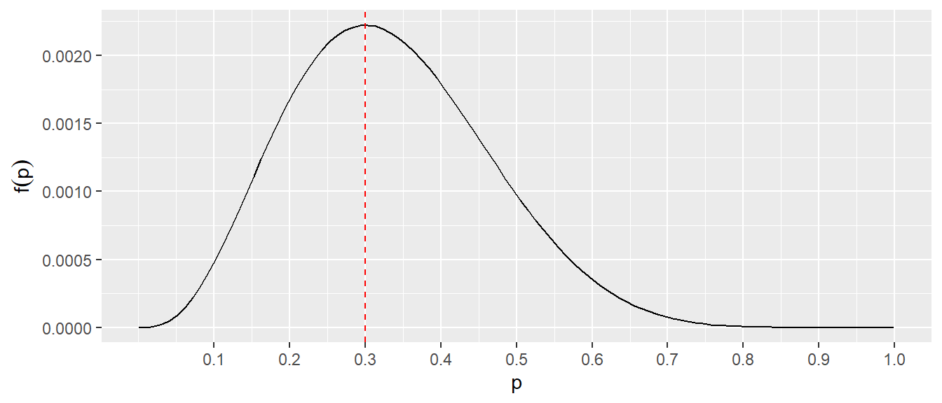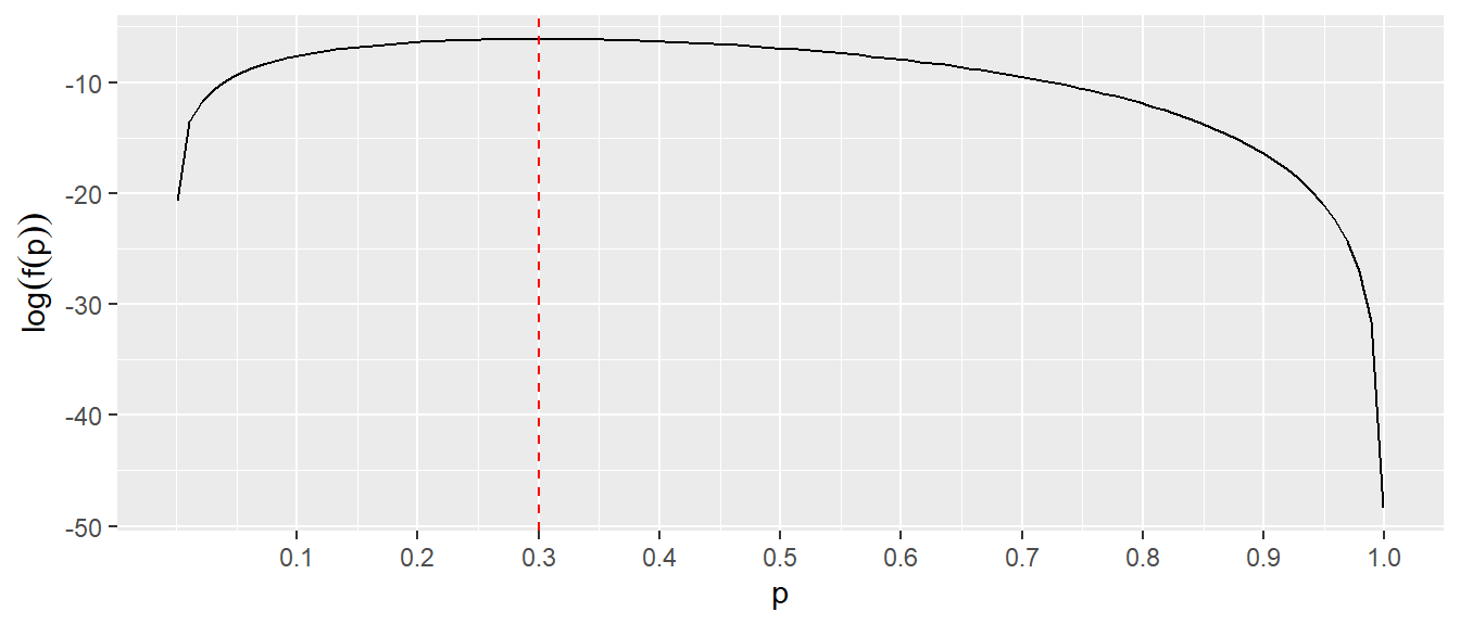 Sei zum Beispiel die Funktion \(f(p) = p^x (1-p)^{n-x}\) gegeben (\(x\) und \(n\) sind unbestimmte Konstanten) und es soll das Maximum dieser Funktion für \(p\) bestimmt werden. Wird nun die Logarithmusfunktion auf \(f(p)\) angewendet ergibt sich der folgende Ansatz: