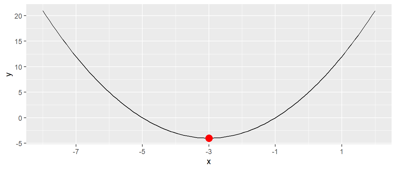 Da die zweite Ableitung eine positive Konstante ist, haben wir bei \(x=0\) den einzigen Extremwert, ein Minimum, gefunden, wie in Abbildung A.8 auch visuell zu erkennen ist.