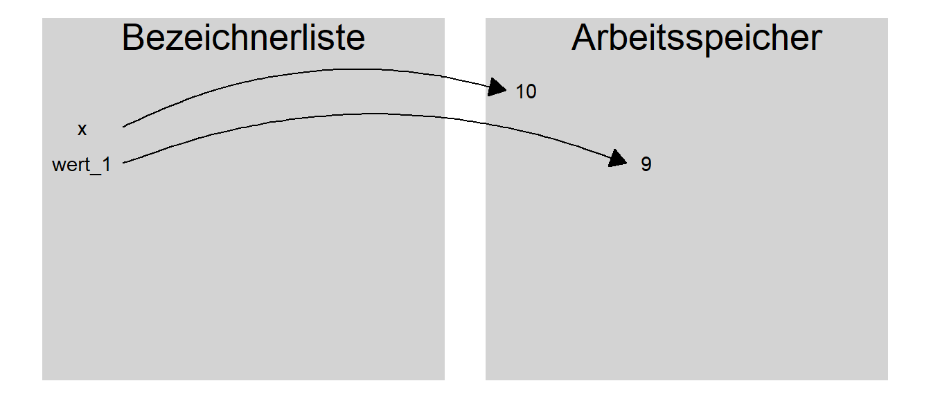 Konzeptionell stellt sich der Vorgang der Zuweisung in etwa so dar. Im internen Speicher von R wird der Wert \(10\) an einer passenden Stelle abgespeichert und in einer Tabelle wird ein Eintrag mit dem Bezeichner x zusammen mit der Adresse des Wertes \(10\) abgelegt (siehe Abbildung 2.1).